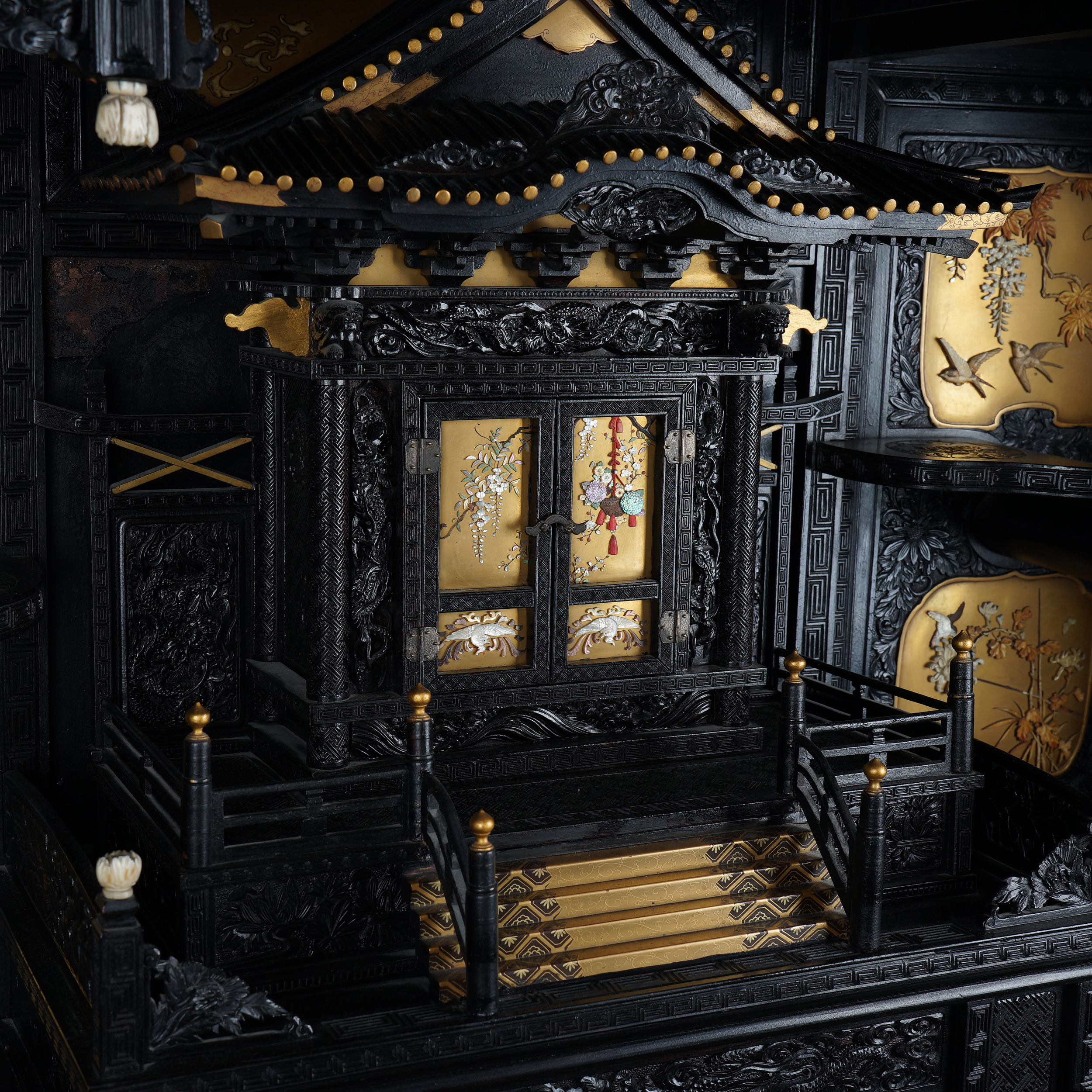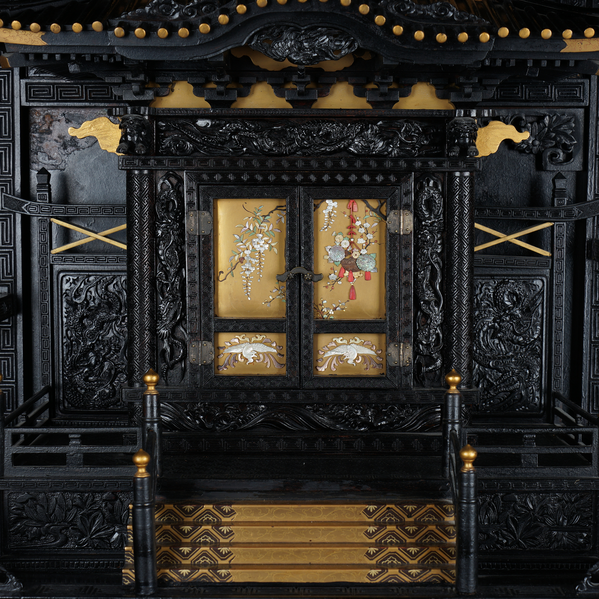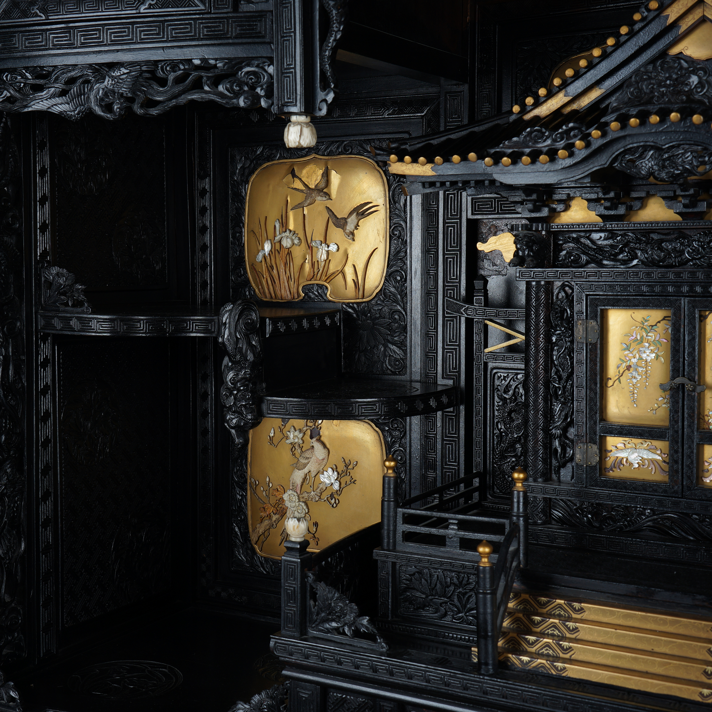 Япония, эпоха Мэйдзи (1868-1912). Дерево, резьба, золотой и цветной лак, инкрустация слоновой костью перламутром в традиционной японской технике сибаяма. Размеры по основанию: 244 х 143 х 56 см; размеры основной части: 244 х 126 х 41 см.