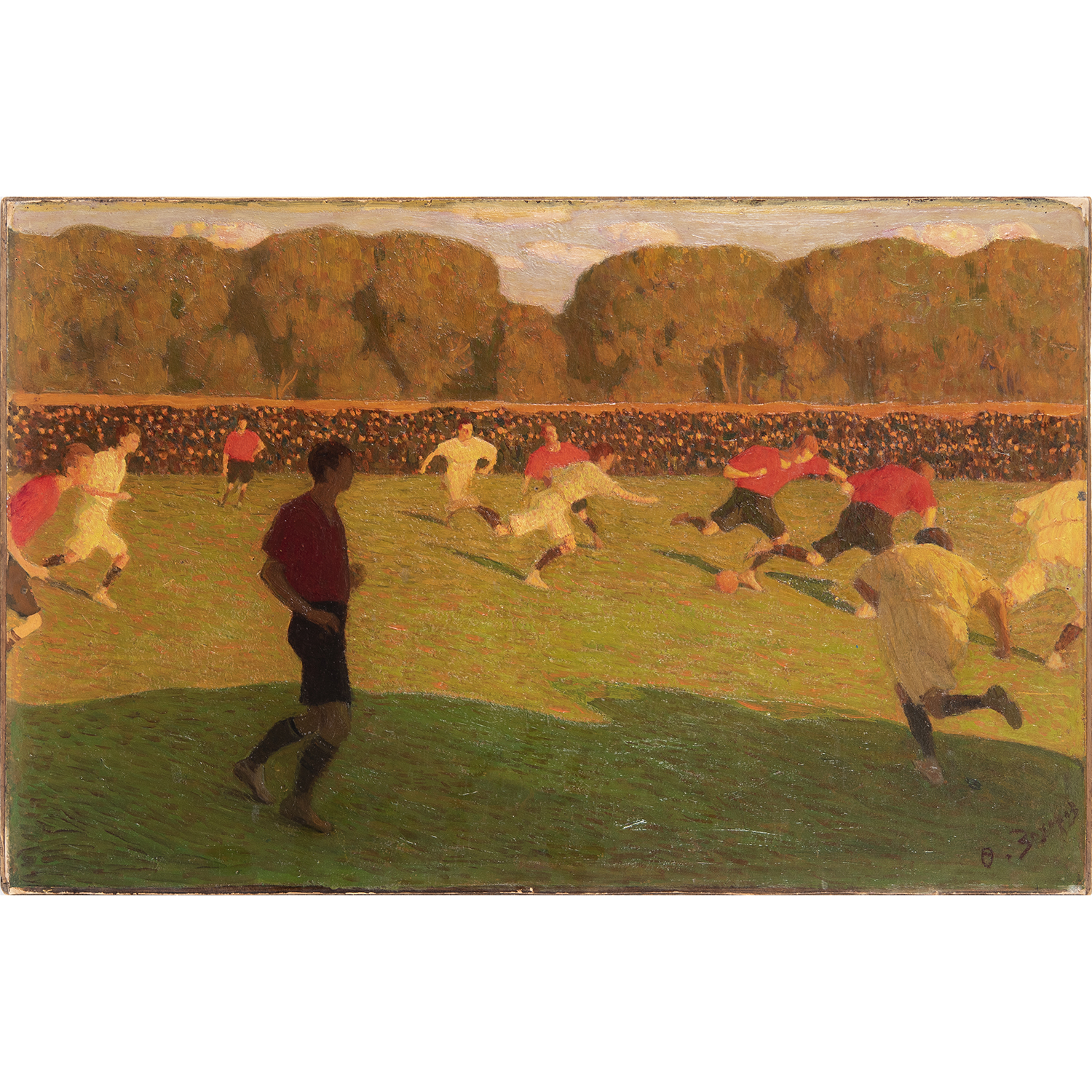 Картон, фанера, масло, справа внизу: «О. З., позже дописано автором «Захаров», на обороте надпись наклейки «Football Feodor Zakharov» и дата «1912», автор: Ф.И Захаров (1882-1968), Россия, 1910-1912 гг. Размеры: 46х71,5 см, в раме 68 х 95см.