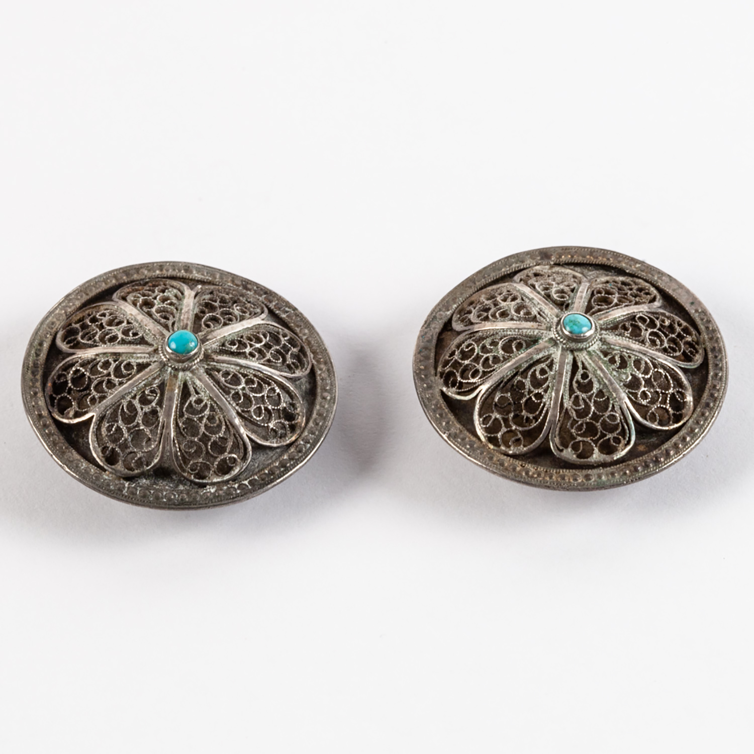 Белый металл, московская скань (филигрань), бирюза, клейма: цифровое 84, мастера - «ЛП», Тбилиси (Тифлис), Грузия в составе Российской Империи, последняя четверть ХIХ века, диаметр 3 см., общий вес: 10 г.