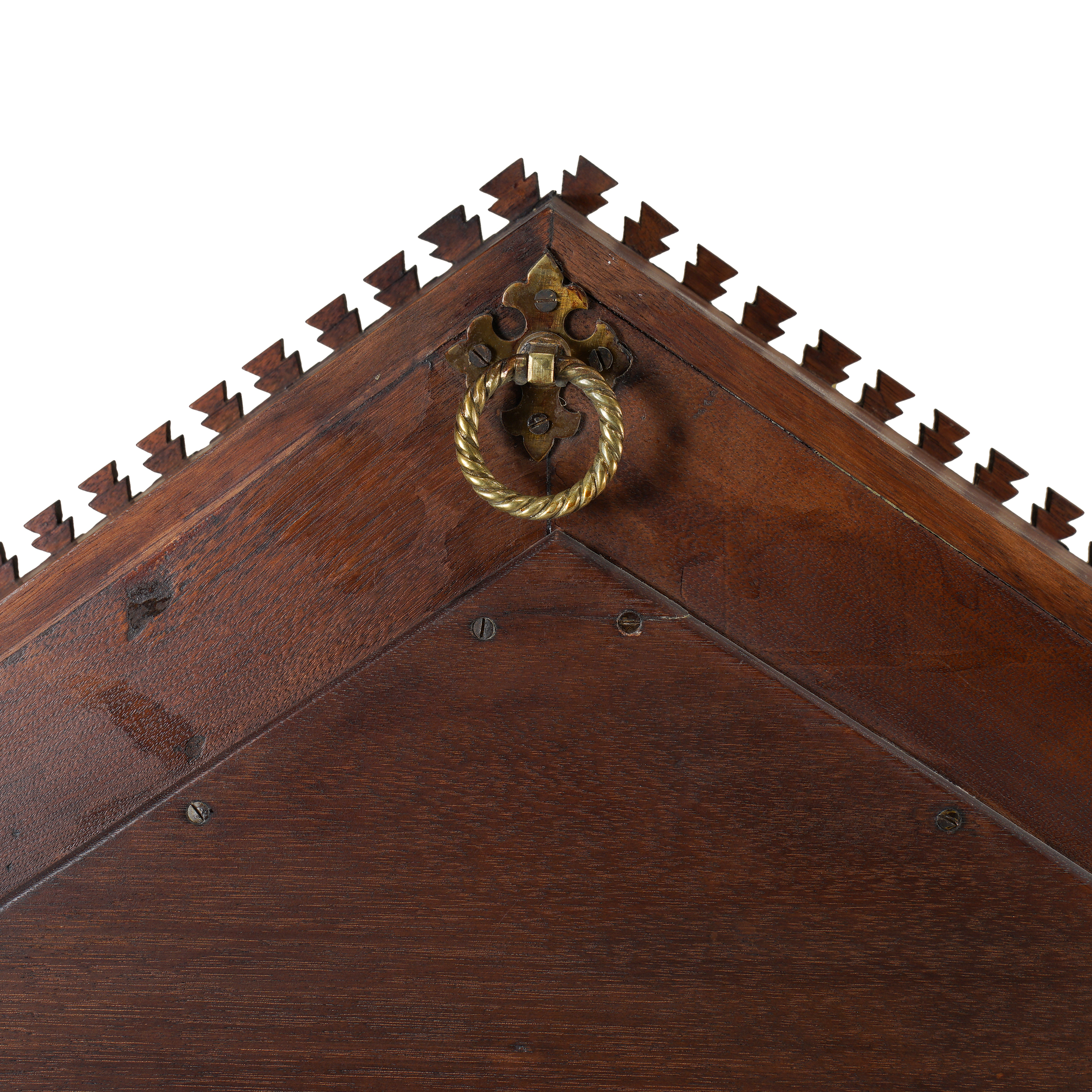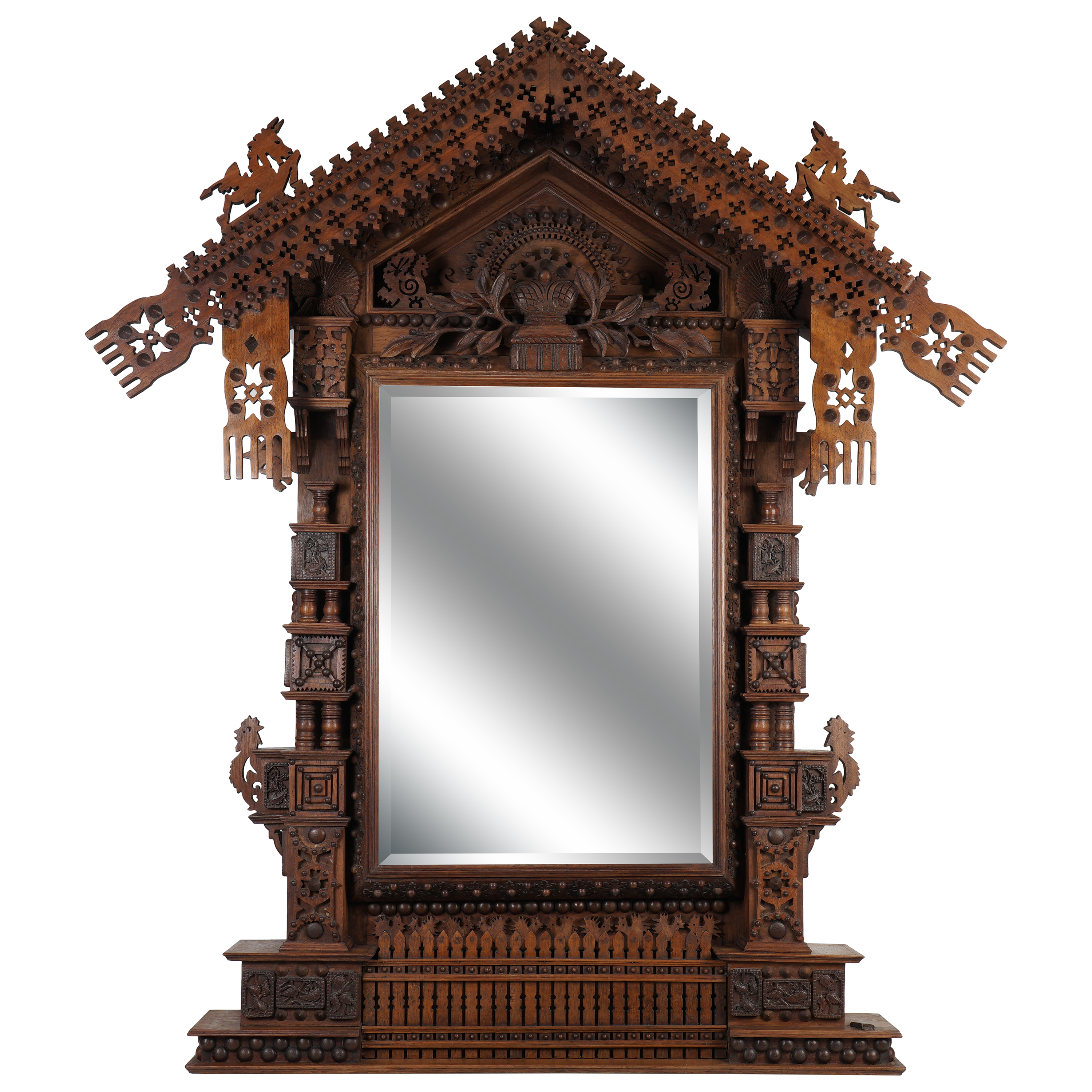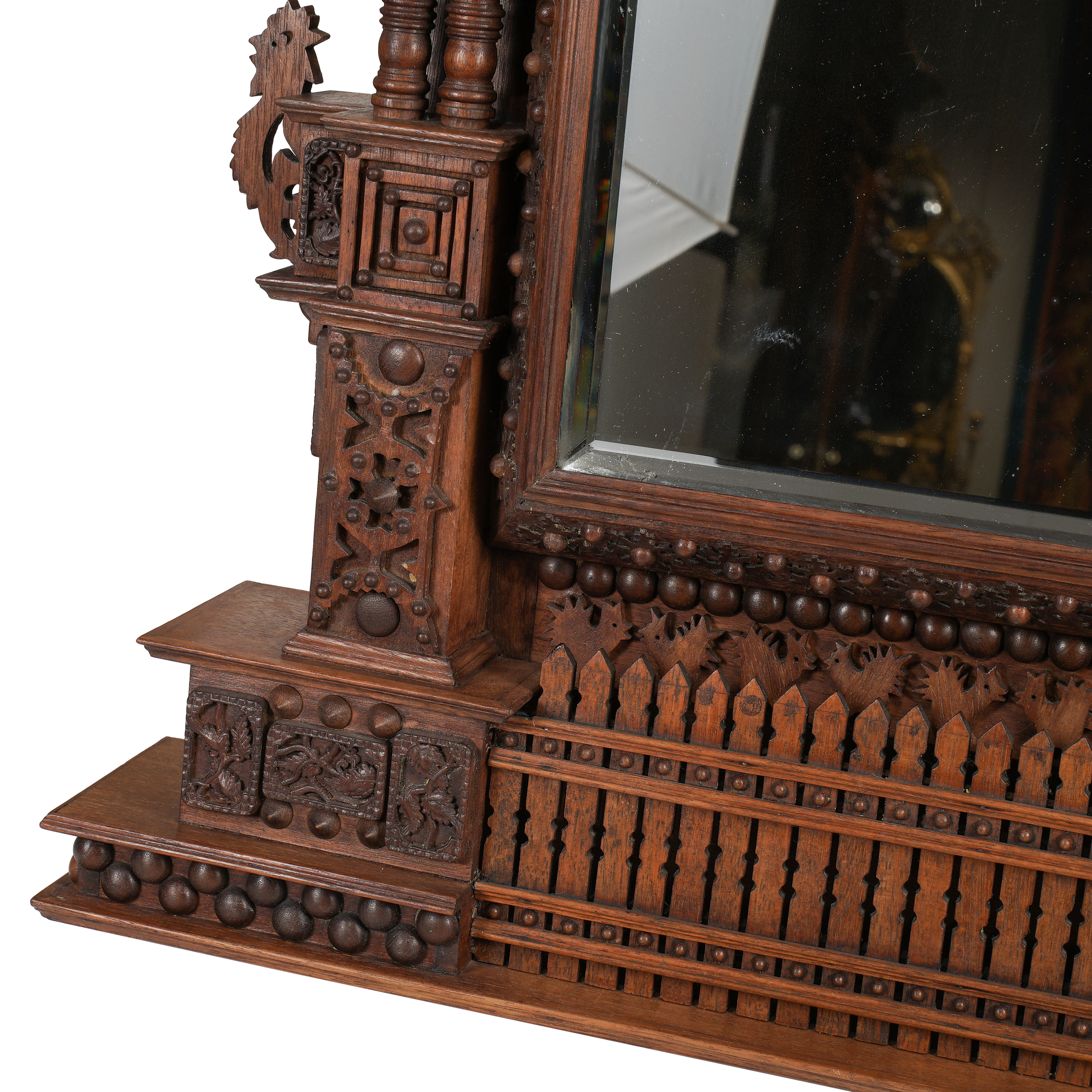 Дерево, сквозная и прорезная резьба, тонировка, зеркальное стекло с фацетом.