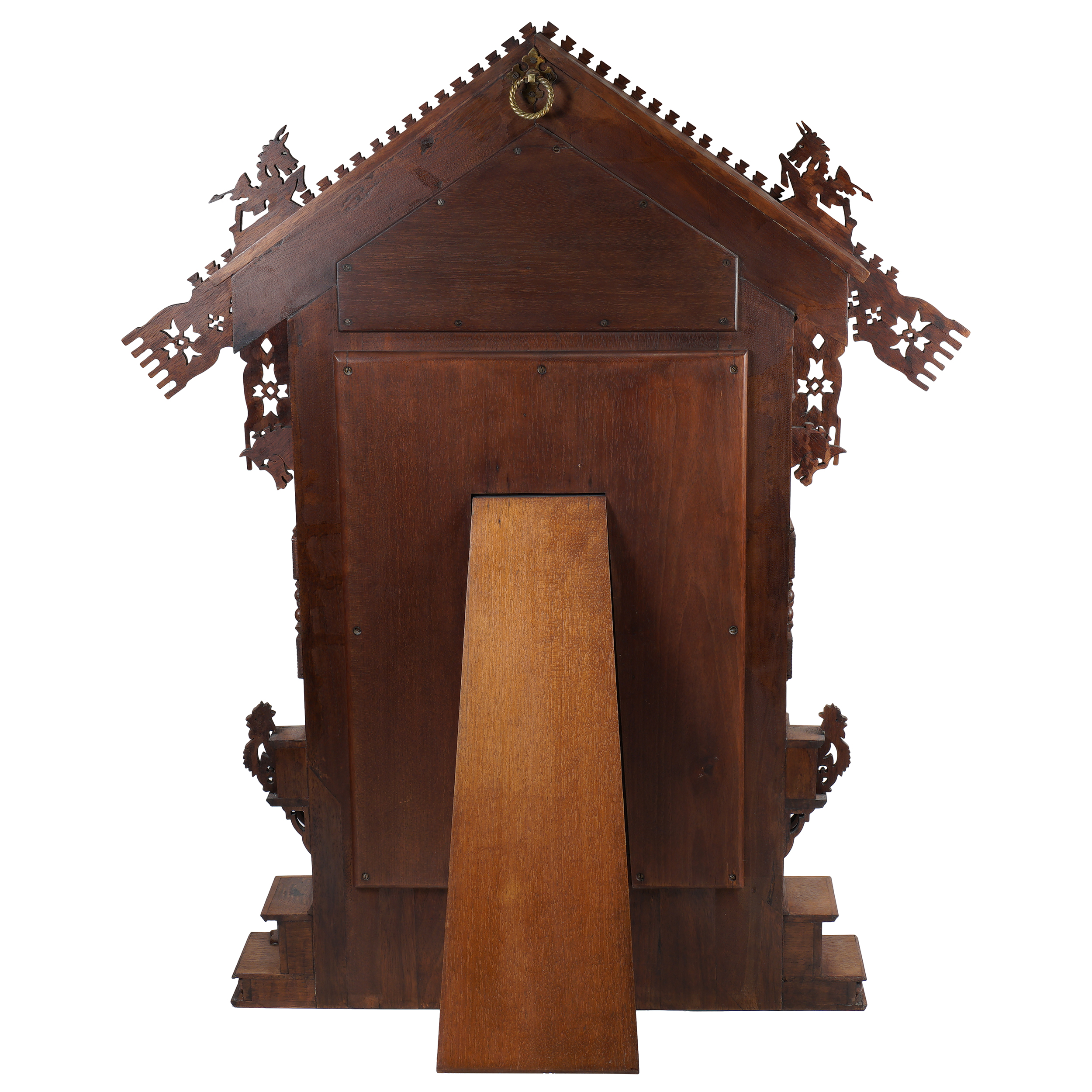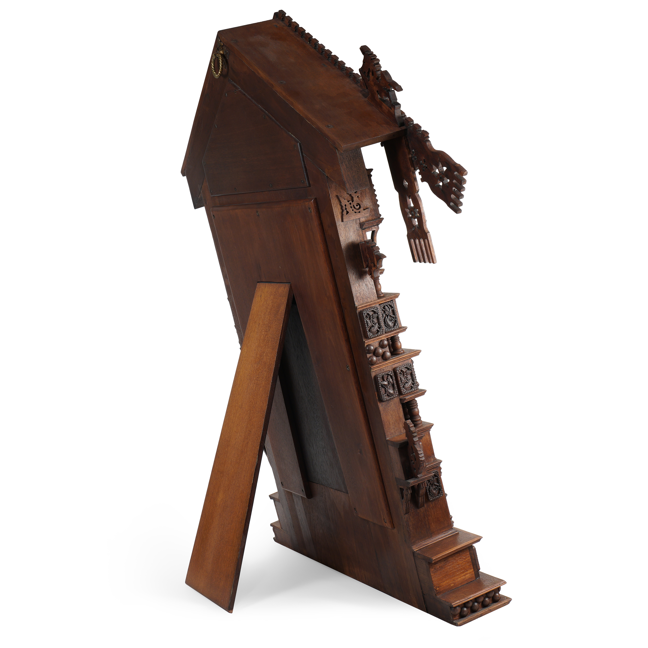 Эти остромодные тенденции можно видеть на примере настенного зеркала, созданного по эскизу В.А. Гартмана. Его форма решена в виде фасада деревенской избы, где каждый «конструктивный» элемент не только служит демонстрацией традиции тончайшей русской резьбы, но также изобилует древними символами и орнаментами. Так, например, в оформлении «крыши» воплощается легенда о боге Солнца, летящем по небу в золотой колеснице: на скатах фронтона в симметричном расположении изображен охлупень – мифический конь-птица, древний образ солнца. Продолжают солярную тематику фигуры петухов – оберега и символа огня, победы света над тьмой. Волнистые линии резьбы, украшающей скат – это причелины, символы небесной воды, проливающейся на землю. Древние архаичные узоры превратились в декоративные мотивы, стилизованные и совмещенные, например, с навершием зеркала в виде императорской короны.
