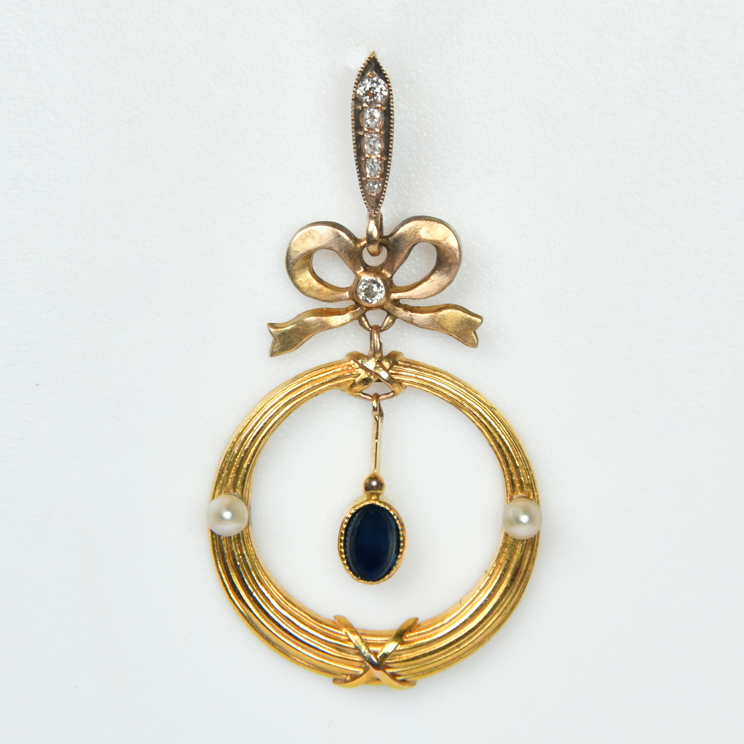 Подвеску отличает утонченность, проработанность деталей, искусная работа по металлу и высококлассная закрепка камней. Декоративный элемент в виде изящного банта с бриллиантом по центру - художественная деталь, нередко встречающаяся в ювелирных изделиях рубежа XIX-ХХ веков.
